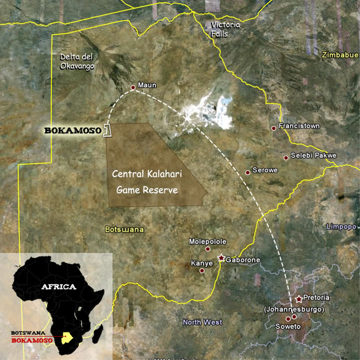 BOKAMOSO is located on the far northwest area of the Central Kalahari Game Reserve. bordering it along 48 km. It is about 150 km drive from the town of Maunand half an hour by light aircraft from the famous Okavango Deltaan out-of-this-world region where amazing especimens of elephants, hippopotamuses and buffalos, as well as an incomparable ornithological fauna coexist.